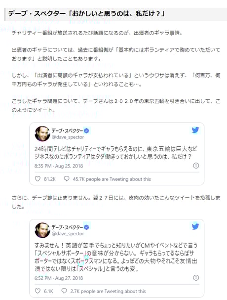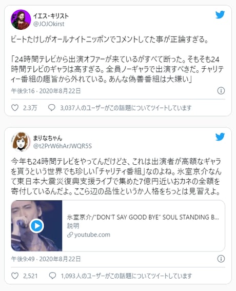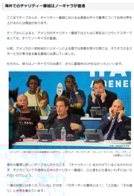 欧米では「チャリティー」では「コンサート」だろうが「番組」だろうが無償が基本で、番組にCMもない。ギャラを貰えば「人気が一気に落ちる」のが普通だそうだ。