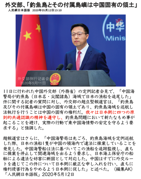 尖閣諸島侵入で、日本に4つの原則的共通認識の遵守を求める中国外交部