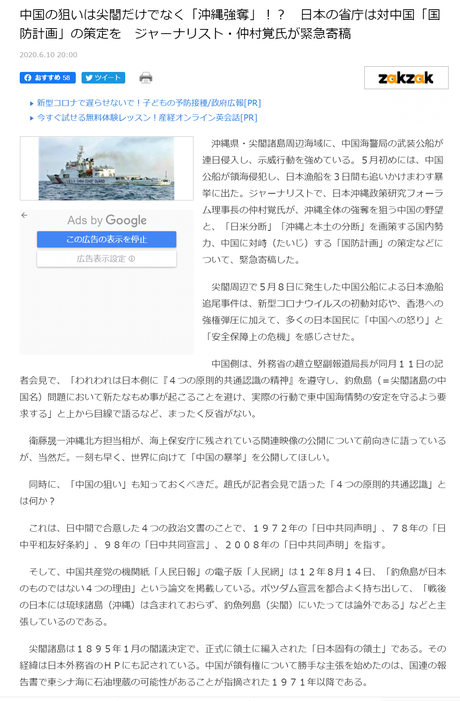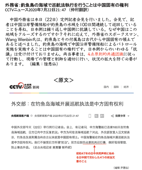 フェイクの理由は、中国外交官が主張して、日中友好の根幹にかかわる、「四つの原則的共通認識の精神を遵守」について国内の報道が欠落していることです。