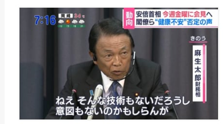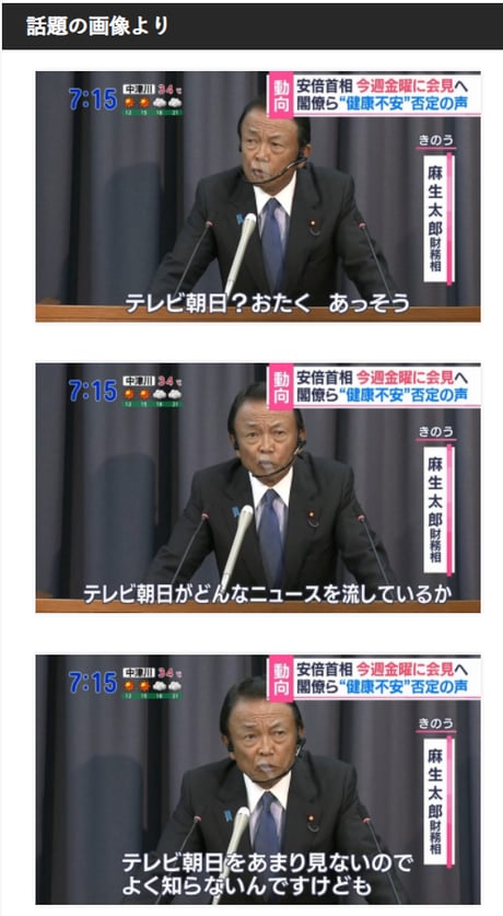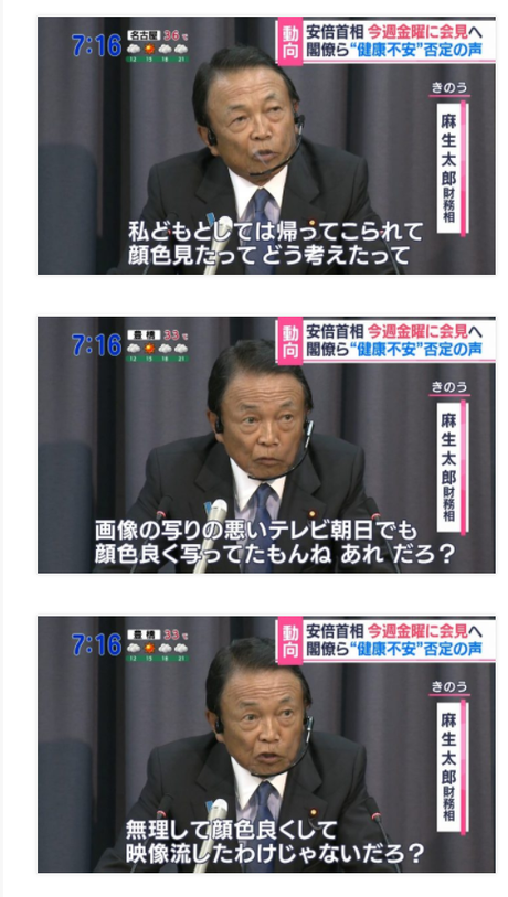 麻生太郎財務大臣「テレビ朝日?おたく?あっそう。各社同じ情報を流してるんですか?あの画像の映りの悪いテレビ朝日でも顔色よく映ってたもんね、あれ。だろ?無理して顔色よくして流したわけじゃないだろ?ねぇそんな技術もないだろうし」