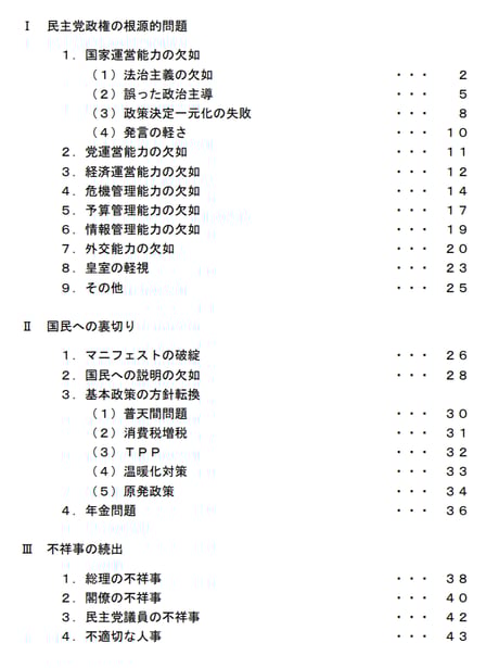 公約倒れの「ガソリン値下げ隊」と「高速道路無料化」。事業仕分けによる防災行政の遅延と科学技術の停滞。赤松口蹄疫などは、完全に人災である。また、「立憲主義」と曰う民主党政権の残党は、民主主義に反する共産主義国のような政治将校による自衛隊の思想統制まで試みた。さらに、米国大統領からルーピー扱いされ日米関係が最悪になっただけでなく、尖閣での巡視艇への中国漁船衝突事件での対応や竹島問題に対する対応など、国民の不安が高まる案件は枚挙に暇が無い。
