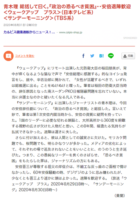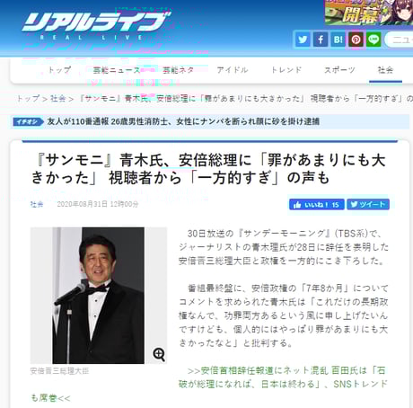 青木理氏「安倍政権は罪が大きかった。安保法制では憲法解釈を閣議決定でひっくり返し疑惑や不祥事を嘘や詭弁でごまかし公文書の改ざんを引き起こし外交は米国に媚びへつらい武器を爆買いし日韓露中は前進せず危機管理も弱くコロナの危機でも後手後手でピント外れの政権だった」