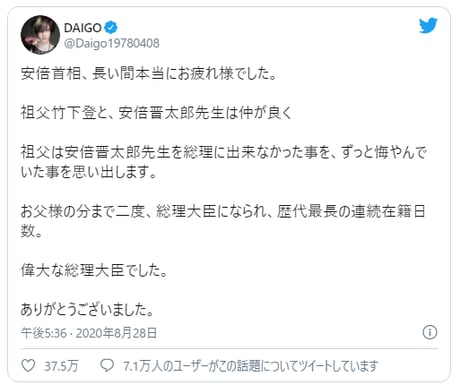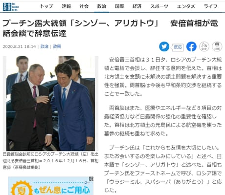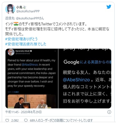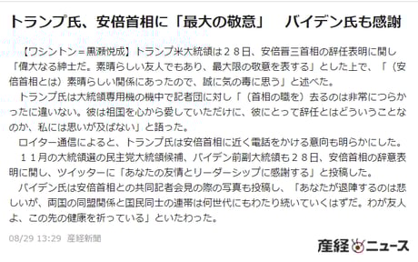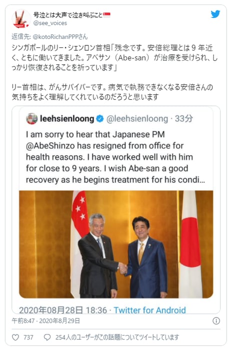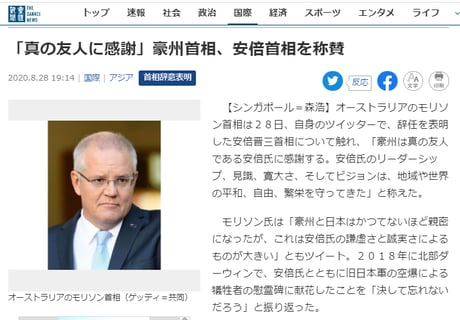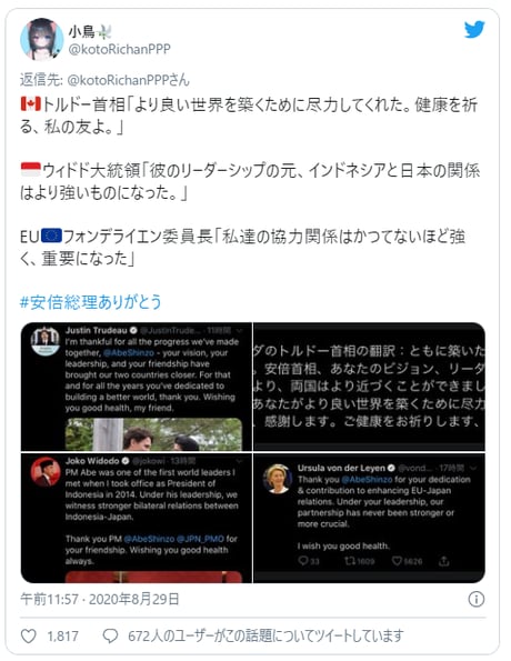 安倍晋三総理の辞任会見に対する各国首脳の反応と