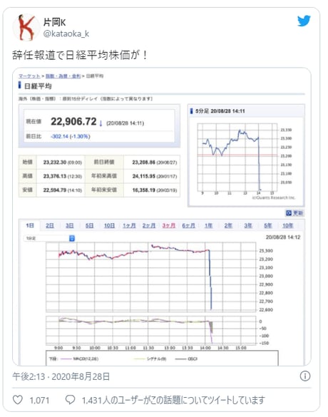 辞任会見直後に株価急落。安倍政権が経済政策で失政続きなら、民主党政権後の株価上昇のように株価は上がるはずでは?