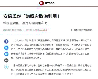 29日付の韓国主要紙は安倍晋三首相の辞意表明を一面などで大きく報じた。韓国では政治的立場を問わず「安倍氏は極右」との見方で一致しており、この日の報道でも保守系の朝鮮日報、革新系のハンギョレが共に社説で、安倍氏が「日本の嫌韓の雰囲気を(支持層結集のために)政治利用した」と指摘。否定的な論調が相次いだ。