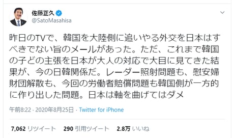 佐藤正久外務副大臣がtweetしたように、「レーダー照射問題も、慰安婦財団解散も、今回の労働者賠償問題も韓国側が一方的に作り出した問題」である。それを報じる事無く「安倍は極右」「嫌韓を政治利用」とだけ報じるのは、悪質なプロパガンダ。