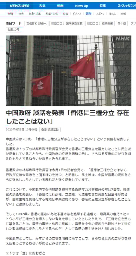 「香港の一国二制度を事実上破棄した『国家安全維持法』で民主化運動の活動家を次々逮捕している」現状や「民主集中制という名の共産党の独裁制は民主主義ではない」事実を併せて報じないのなら、報道機関ではなく中国共産党の広報機関だ。