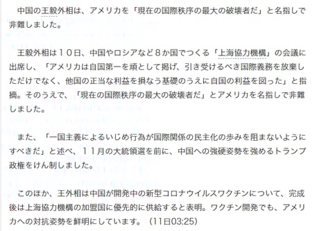 王毅外相は10日、中国やロシアなど8か国でつくる「上海協力機構」の会議に出席し、「アメリカは自国第一を頑として掲げ、引き受けるべき国際義務を放棄しただけでなく、他国の正当な利益を損なう基礎のうえに自国の利益を図った」と指摘。そのうえで、「現在の国際秩序の最大の破壊者だ」とアメリカを名指しで非難しました。