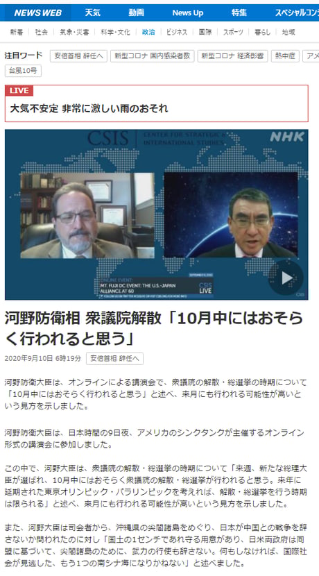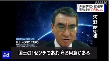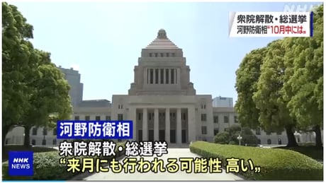NHK「河野防衛相 衆議院解散「10月中にはおそらく行われると思う」」