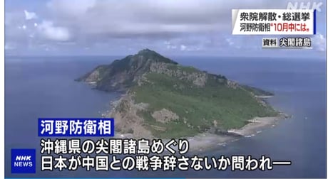 河野防衛相を矮小化する報道だ。解散コメントは重大でない。河野氏の重要な言葉は「国土の1センチであれ守る用意があり日米は同盟に基づいて尖閣侵略に武力行使も辞さない。何もしなければ国際社会が見逃したもう1つの南シナ海になりかねない」という言葉だ。