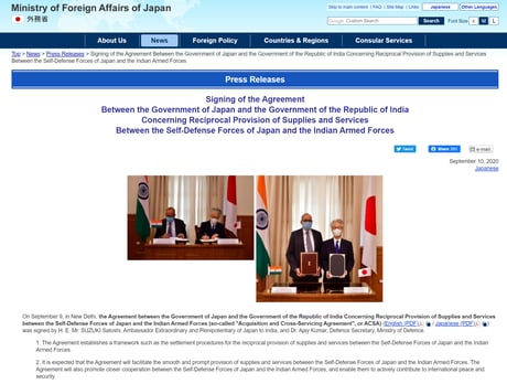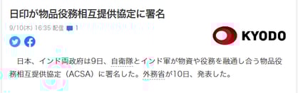 日本、インド両政府は9日、自衛隊とインド軍が物資や役務を融通し合う物品役務相互提供協定(ACSA)に署名した。外務省が10日、発表した。