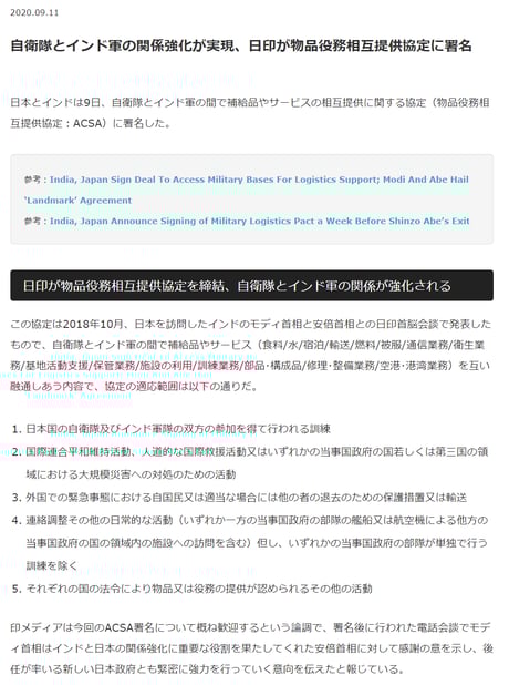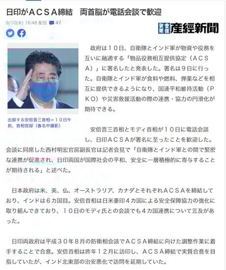 「ACSAの締結により、日本の自衛隊とインド軍が食料や燃料,弾薬等を相互に提供できるようになって連携や協力の円滑化が進む」という重要な意味を一切報じない。日本が輸入する原油の9割が通過する中東からインド洋に居たるシーレーンの防衛力アップになると共に、第二次安倍政権で総理就任時に唱えた「民主主義への脅威となる中国封じ込めのダイヤモンド構想」の中核となる日印同盟への大きな一歩でもある。