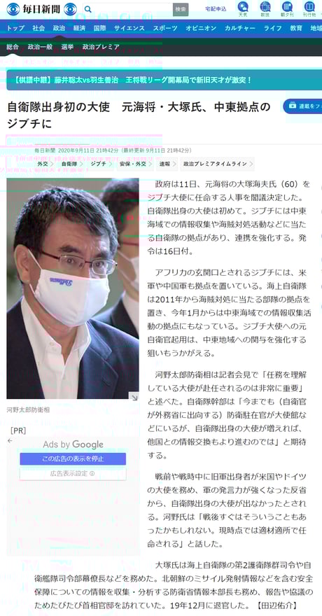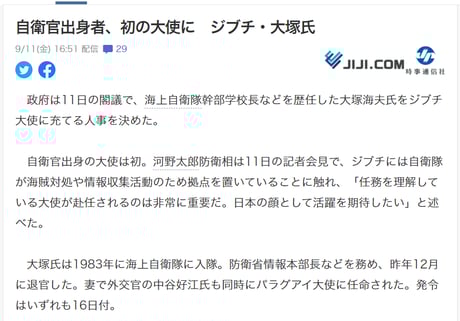 毎日新聞は「元軍人が大使になる = 軍の発言力が強くなる 」と印象操作して、「元自衛官の大使= 軍国主義」と連想させたいようだ。さすがは「中国共産党に金で飼われている」と英国紙に名指しで報じられた新聞。人民解放軍のために元自衛官の大使赴任に不安を持たせるためのネガティブ表現の挿入を忘れない。