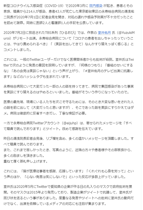 しかし、これに東京歯科大学教授の寺島毅氏が「現場のスタッフは、不安の中逃げ出したいと思いながらも、日々の業務をこなしてきたんだと思います」「3月当時はまだ無症状の人でもうつす、あるいは発症の前もうつすってことも分かってませんでしたし、プラスチックとか金属とかベッドの手すりとかにもウイルスが3日、4日いるってことも分かってませんでしたから」と情報が少ない中対応した現場の医師や看護師に同情的な発言をし、どこの病院でも起こりえたことだとしたが、室井は「でも、病院から広がるなんてことはやめてほしいですよね!」「もっと注意しなければいけなかったと思うんです」と主張。MCの恵俊彰から「広げたいと思っていたわけではないと思う」「その段階でどれだけのことが日本の病院でできたのか。この未知のウイルスと戦うにあたってどんな準備ができたのかっていうことを本当に責めていいのか、と。僕自身はそうかは分からないです」と諫められていた。