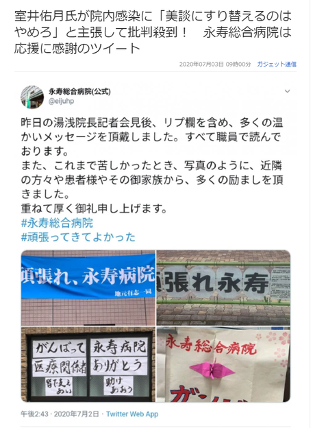 新型コロナウイルスの大規模クラスターが発生した、東京・台東区にある永寿総合病院について取り上げていた際の一幕。1日に院長が記者会見を開き、入院患者43人が死亡したことについて謝罪しており、会見と併せて医師や看護師計3人の手記が公開されている。