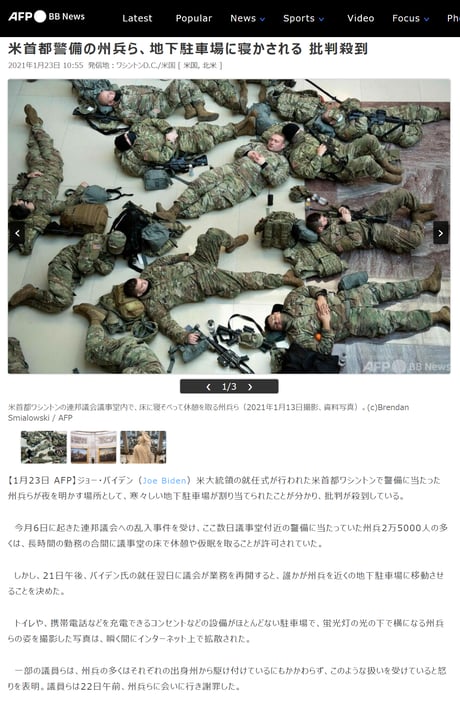 大統領就任式が終わった途端に、ワシントンDC警備の州兵たちが冷遇された問題! 冷たく狭い駐車場に押し込まれた州兵の写真が出回って、全国からバイデン政権への批判が殺到。コロナウイルスの危険が叫ばれる中、寒くて密の屋内駐車場に押し込まれた大群の兵士たち。その駐車場には、トイレがたったのひとつしかなくて、電源コンセントもたったのひとつしかなく、スマホの通信環境もなかったと報じられている。このような酷い環境に追いやられた事に対して、或る州兵は「裏切られたと感じている」と言い、一部の議員たちは「これは州兵への侮辱だ」と批判した。この批判の高まりを受けて、バイデンは州兵局長に電話で謝罪した。しかし、バイデンは電話謝罪はしたものの、州兵たちのもとに謝罪に出向くことはなかった。一方で、トランプはワシントンDCにある自分のトランプホテルを州兵や警官たちに無償で開放した。【元特派員と学ぶ時事英語】