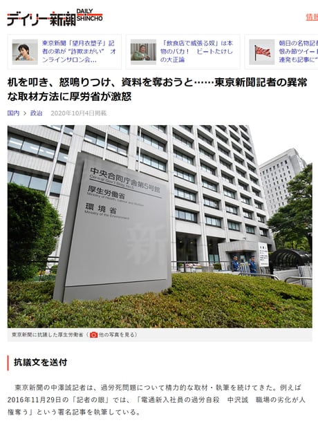 東京新聞が厚労省に謝罪 記者が職員に「暴力的行為」