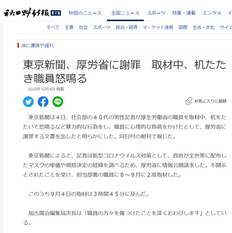コロナ関連の取材で、厚労省の担当者を、長時間にわたって怒鳴り散らすなどした。