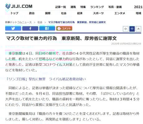 マスク取材で暴力的行為 東京新聞、厚労省に謝罪文