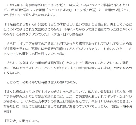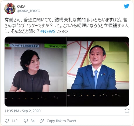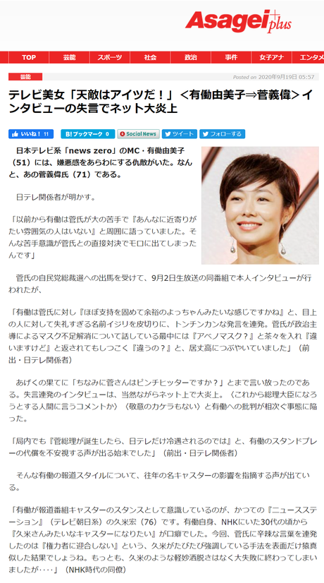 あげくの果てに「ちなみに菅さんはピンチヒッターですか?」とまで言い放ったのである。失言連発のインタビューは、当然ながらネット上で大炎上。〈これから総理大臣になろうとする人間に言うコメントか〉〈敬意のカケラもない〉と有働への批判が相次ぐ事態に陥った。