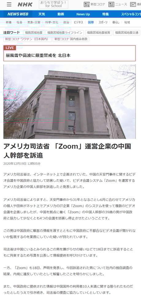 アメリカ司法省 「Zoom」運営企業の中国人幹部を訴追
