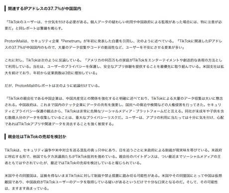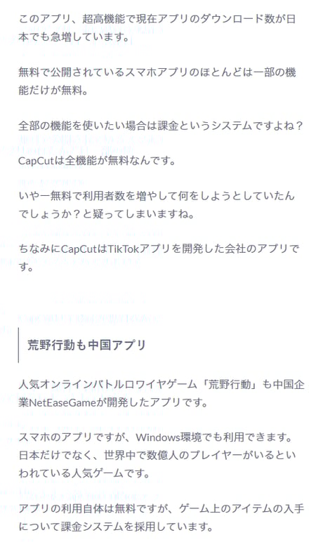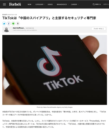中国共産党は「中国市民と企業に、地理的境界に関係なく、『諜報活動』への参加の法的責任と義務を負わせる『国家情報法』」を施行し、中国製アプリは当然その制限を受ける。また、中国製アプリはインストール時に「録音」「ネットワークへのフルアクセス」「端末データの利用」などの権限を許可するよう要求する。つまり、TikTokでアップする動画は無害なものであっても、「アプリ権限で収集される個人データ」や「端末の盗聴器としての利用」などが、中国共産党の一存で可能になる。これが「スパイ」でなくて何なのだろう?