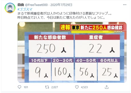新規の重症者は1名なのに、あたかも22名増加したかのような印象を与え、コロナに対する恐怖感を煽っていた。