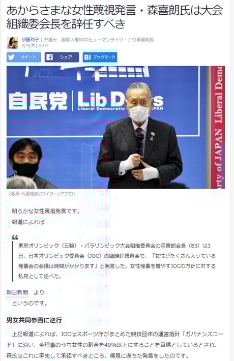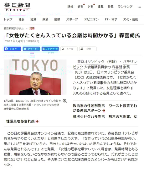森会長は、今月3日のJOC臨時評議員会で「女性がたくさん入っている理事会の会議は時間がかかります」という女性蔑視発言をし、批判が拡散していった。