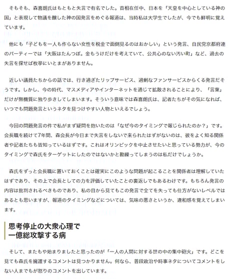 闘病しながら、幅広い人脈を生かして、長年無償でオリンピックに尽くしてきた高齢者に対して、たった一つの失言で全てを否定するような報道は「リンチ」と呼ばれるのも当たり前だ。北國新聞の取材に森元首相のご夫人が「まるで犯罪者みたい」と零すほどに追い込むマスコミは「人権を尊重している」などと言えるのか?
