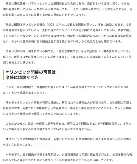 森元首相発言の全文を読めば、『下げて上げる』話術の典型で「女性は色々と言われているが、非常に優秀で役立つ発言をして下さるので、欠員が出て理事を選ぶ時は女性にしている」と述べており、けっして女性蔑視などでは無い。