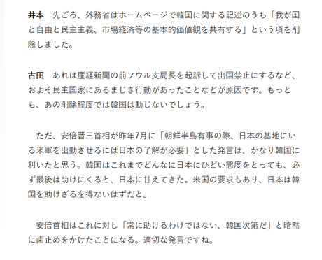 共同通信は同日、日本の与党である自民党議員たちの間で「(韓国を)助けず、教えず、関与しない『非韓三原則』で行こう」(中堅議員)というなど韓国蔑視とも受け取れる言葉が出ている、と伝えた。