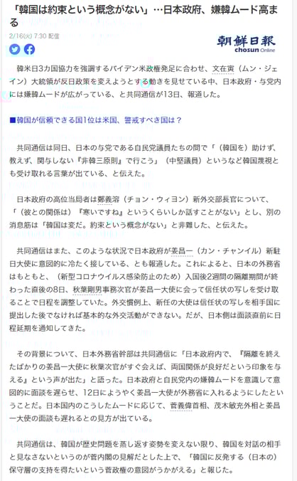 ※ 朝鮮日報が引用したとする「共同通信の記事」が見当たらないため、フェイクニュース大賞としては共同通信でなく、朝鮮日報をノミネートしました。