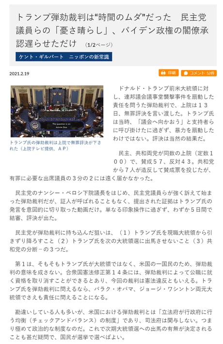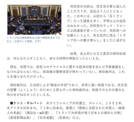CNNキャスターは今回の結果を「党派的」と批判したが、それは違う。民主党上院議員の有罪票は当然だから、真の票差は7対43だ。今もトランプ支持層は健在であり、この勇気ある共和党上院議員7人は、今後引退するか、もともと選挙に強い人々だろう。残りの43人も決してトランプ支持者ではない。恐らく、己の再選のために無罪票を投じたのだろう。
