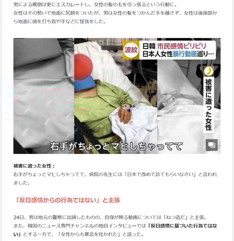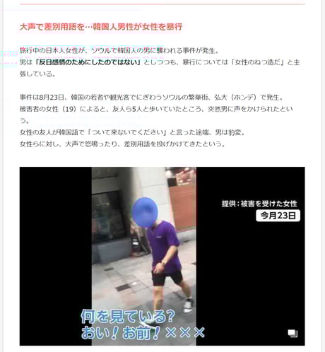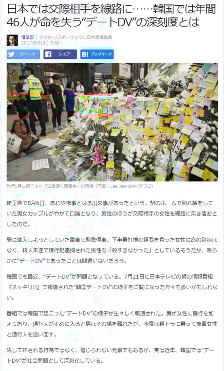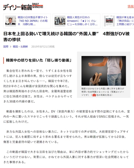 韓国では「デートDV」での犠牲者が5年間で233人にのぼり、その多くは御女性です。韓国精神健康学会によれば、韓国成人の半数以上が怒りをうまくコントロールできない“怒り調節障害”を患っていて、「女性嫌悪」による傷害事件も多発しています。「外国人妻に対する暴行傷害や殺人事件」も多発していて、外国では韓国人男性の暴力性から自国民に注意喚起する国まであるのにこんな特集する日本のメディアは異常。