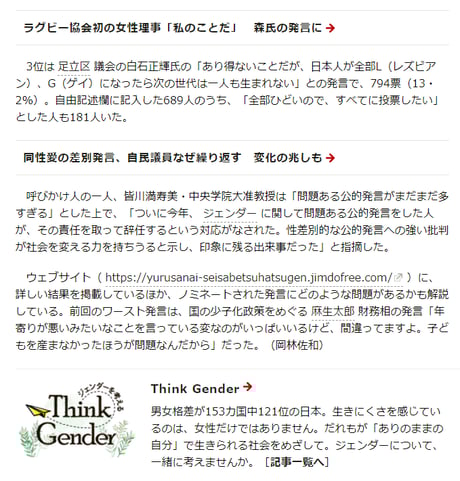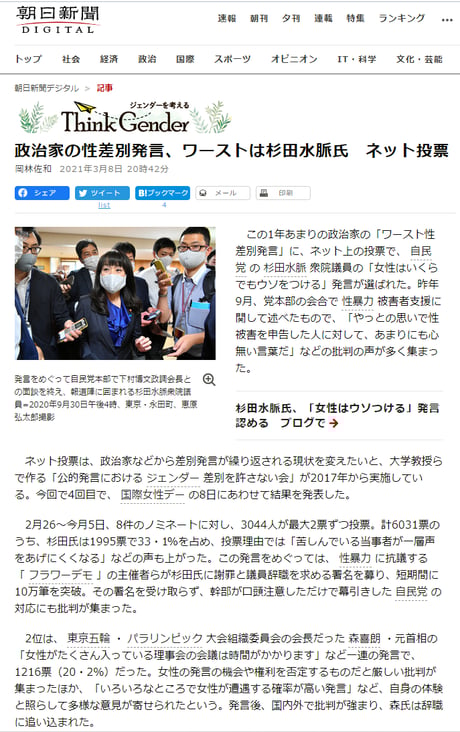この1年あまりの政治家の「ワースト性差別発言」に、ネット上の投票で、自民党の杉田水脈衆院議員の「女性はいくらでもウソをつける」発言が選ばれた。昨年9月、党本部の会合で性暴力被害者支援に関して述べたもので、「やっとの思いで性被害を申告した人に対して、あまりにも心無い言葉だ」などの批判の声が多く集まった。