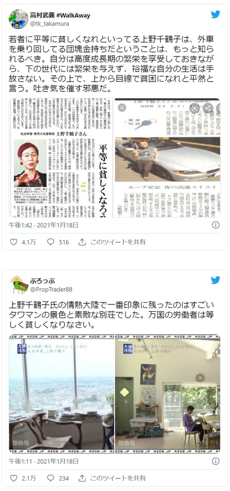 「平等に貧しくなろう」の上野千鶴子氏、タワマン生活で炎上。背景に団塊への怨嗟か