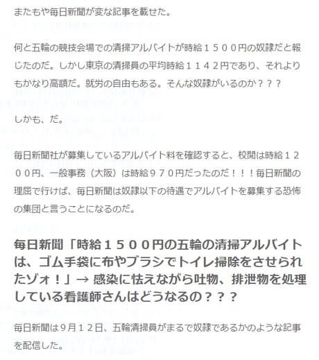 規模は違えどトイレ掃除や食べ残しの処理は普通の飲食店のバイトでもします。いくら五輪や政府批判したいからってこういう取り上げ方ってとても配慮に欠いていると思います。