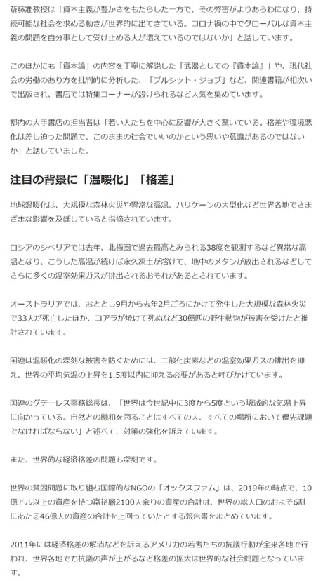 当時マルクスが指摘した格差の拡大や気候変動などが現代にも通じると大きな関心を集めている。