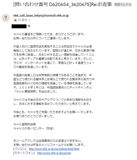 ・NHKへの「日本人から視聴料を徴収して、中国人向けの無料番組放送している件」に対する質問へのNHKからの返答