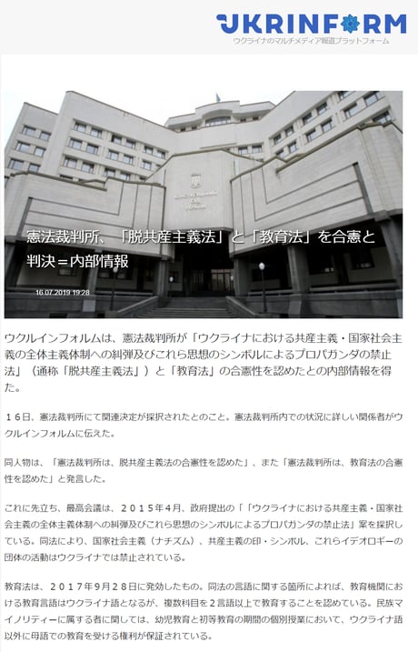 憲法裁判所が「ウクライナにおける共産主義・国家社会主義の全体主義体制への糾弾及びこれら思想のシンボルによるプロパガンダの禁止法」(通称「脱共産主義法」)と「教育法」の合憲性を認めた。