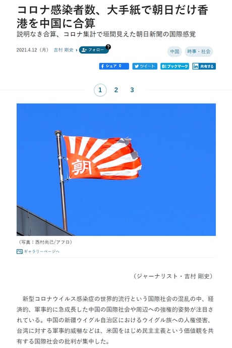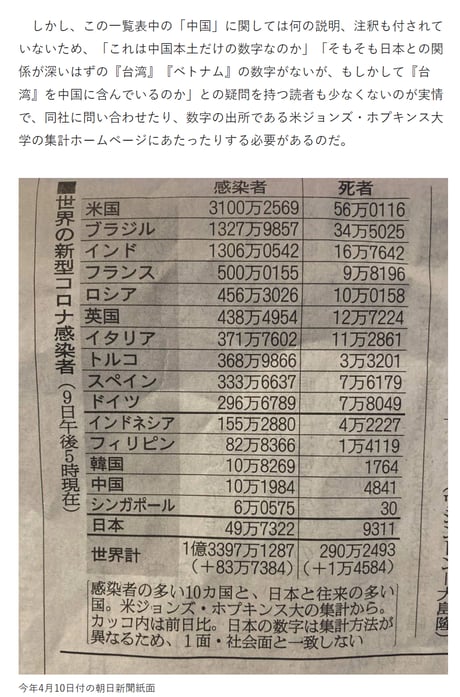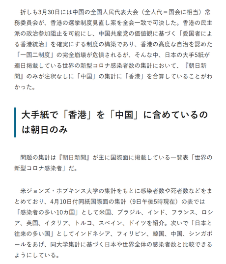 日本の大手5紙の中で、唯一"新型コロナ感染者数の集計において注釈無しで「香港」を「中国」の集計に合算"した朝日新聞。中国共産党による「一国二制度」の完全破壊に加担する記事と云えよう。