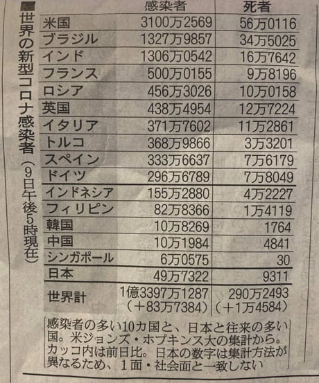 [国際面に掲載している一覧表「世界の新型コロナ感染者」]