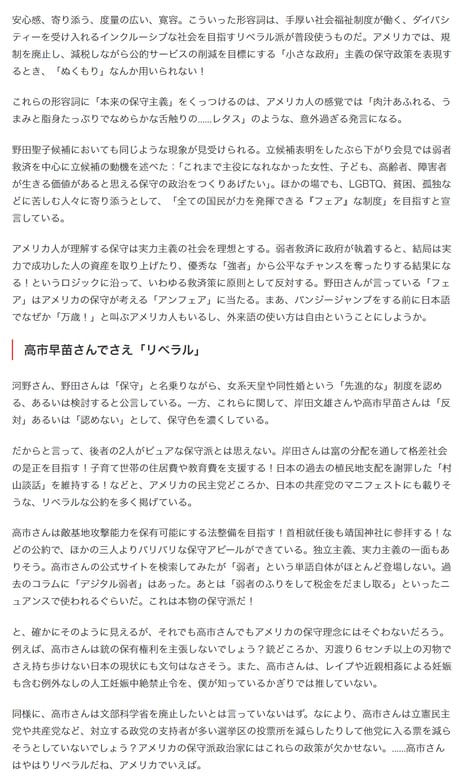 「高市さんは、自身が総裁になる意味付けよりも、自民党はみんな保守なので、保守の中でも右側なんですね。要するに右翼、右翼層を河野さんから取るっていうことだと思う」