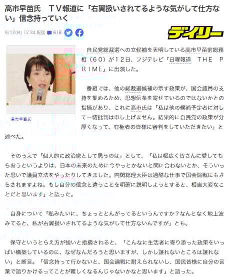 「9月12日放送のフジテレビ「日曜報道 THE PRIME」に出演した高市早苗氏が、自民党総裁選をめぐるテレビ報道に対して、苦言を呈する場面がありました。