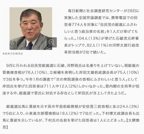 104人(13%)が挙げた石破茂元幹事長がトップで、82人(11%)の河野太郎行政改革担当相が2位で続いた。