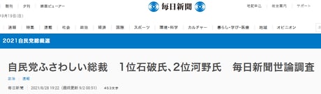 9月に行われる自民党総裁選に石破、河野両氏は名乗りを上げていない。現総裁の菅義偉首相が76人(10%)、立候補を表明した岸田文雄前政調会長が75人(10%)で3位を争う。今年1月の調査で「次の衆院選後の首相にふさわしいと思う人」として岸田氏を挙げた回答者は711人中12人(2%)しかいなかった。菅内閣の支持率が低迷する中、総裁選で菅氏に対抗する存在として岸田氏が浮上してきたようだ。
