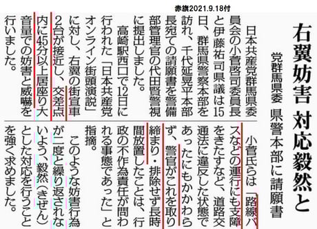 12日に高崎で行われた山添議員の演説会で、街宣右翼が交差点に居座って、45分も妨害し続けました。