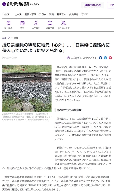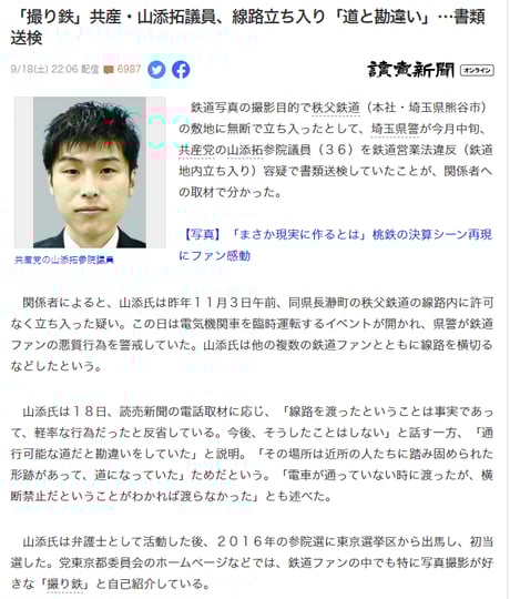 日本共産党国会議員・弁護士山添氏は鉄道写真撮影のため会社敷地に無断侵入し書類送検される。