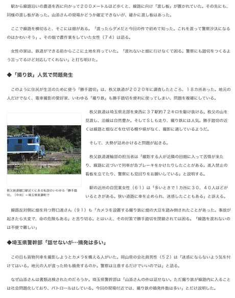別に肩を持つわけではないけど、秩父鉄道には第4種踏切が約100ヶ所あって、第4種踏切だと思ったら勝手踏切だったというような場所もあるから、まぁ気の毒ではあるよね。