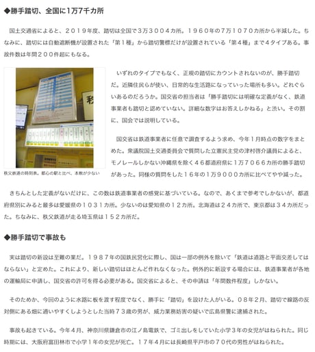 ・このニュース、現地まで取材に行きながら実際に渡った生活道路を写さずホームと線路のみの映像で、バイアスをかける報道になっている。このタイミングでの「書類送検」見出しは香山リカら「書類送付」と同じ危惧を最低限持つべきだ。